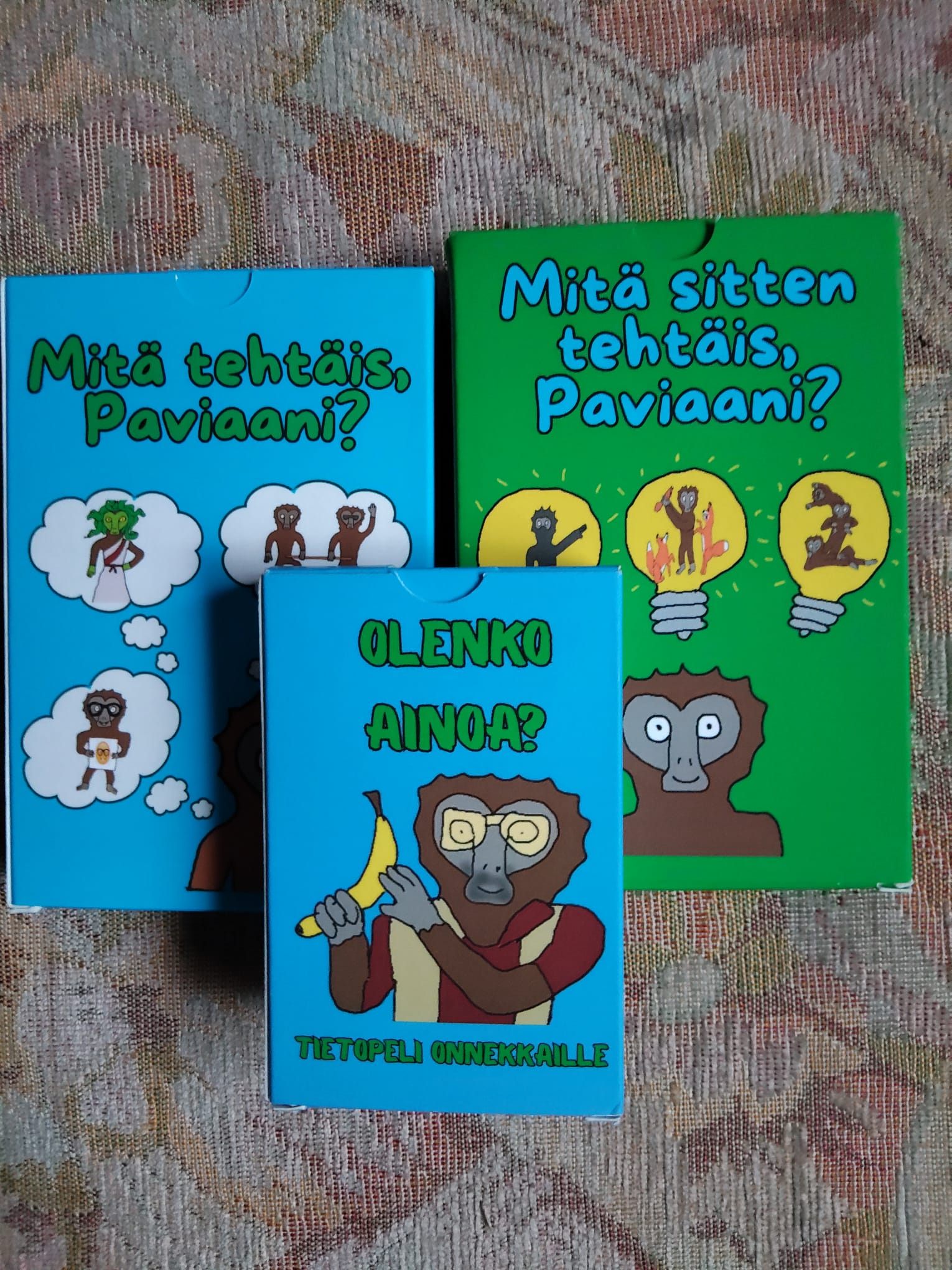 Sisältää molemmat Mitä tehtäis, Paviaani-leikkipakat sekä Olenko Ainoa?- tietopelin.